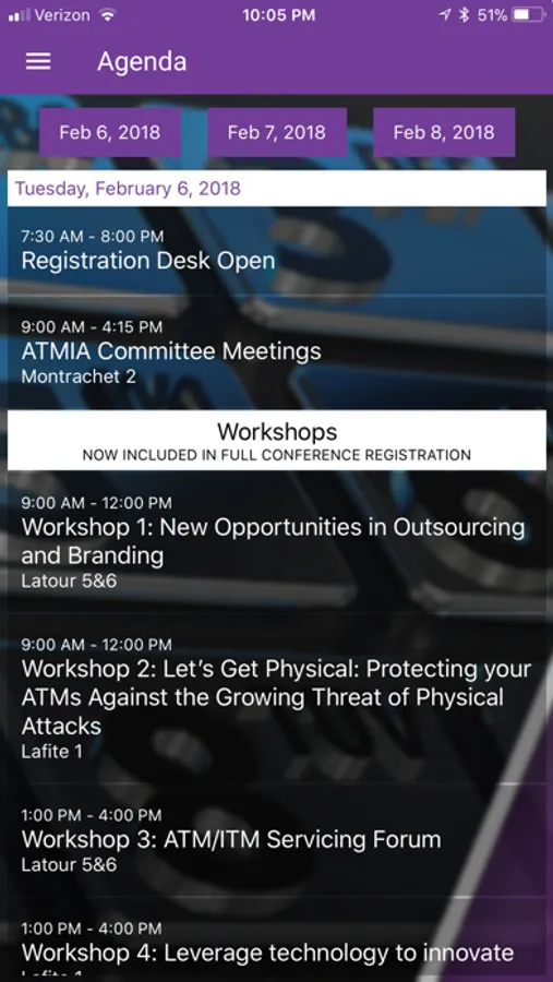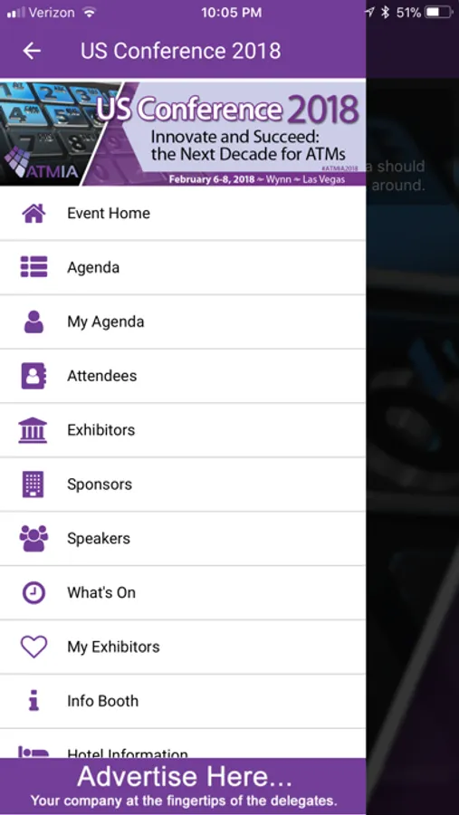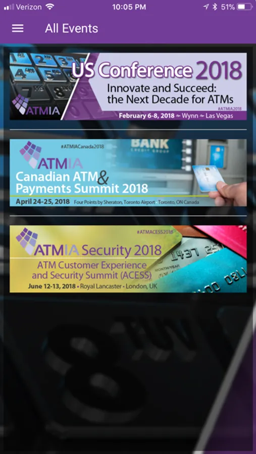 The ATMIA Conference app allows you to access public information about all ATMIA conferences. The information includes a listing of all upcoming conferences, agenda, listing of exhibitors and the layout, sponsors, speakers, hotel details and much more. All registered attendees for an event will have access to restricted material and content. You are also able to customize each event for you.