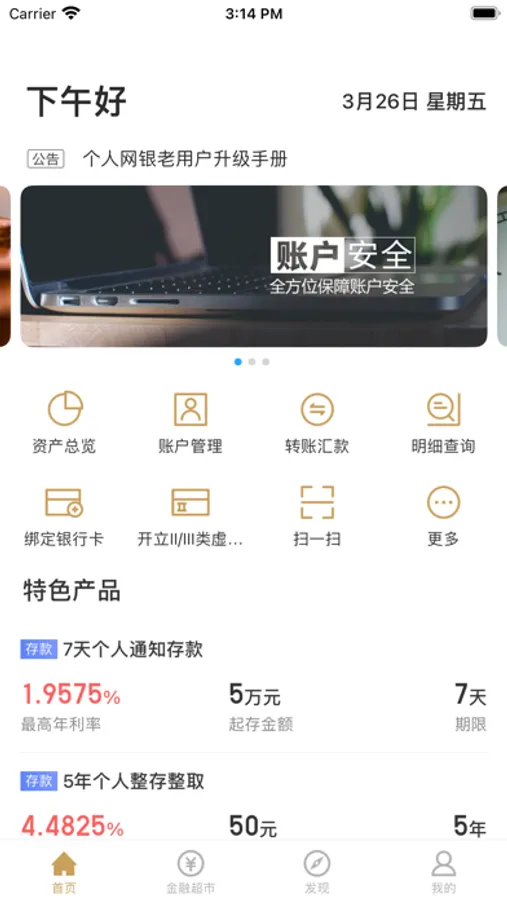 手机银行为您提供账户查询、账户管理、行内转账、跨行转账、本人账户互转、活期转定期、定期转活期、通知存款开立、通知存款支取等丰富的移动金融服务。