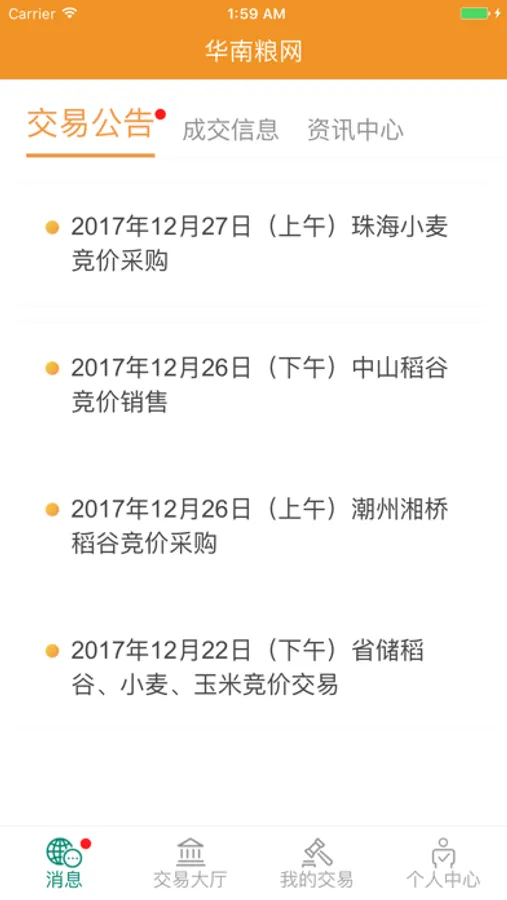 华南粮网APP是广东华南粮食交易中心推出的与华南粮网门户网站及华南交易网站信息及功能同步的移动APP。内含消息、交易大厅、我的交易、个人中心四个板块。