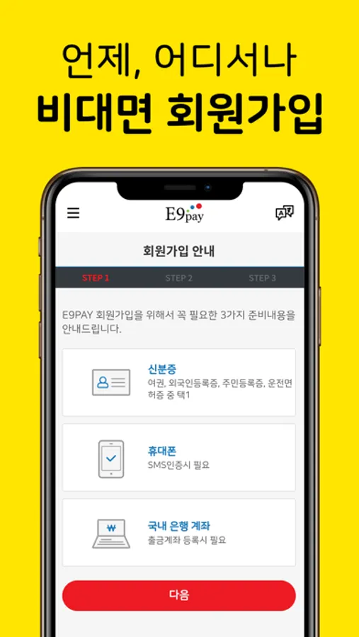 1) 방문없이 핸드폰으로 간단하게 비대면 회원등록(신분증, 전화,계좌번호 필수)