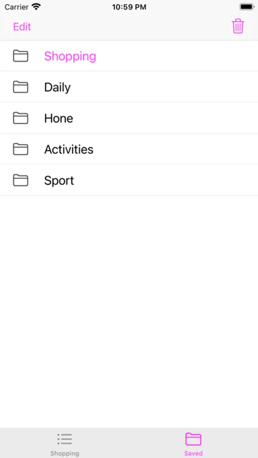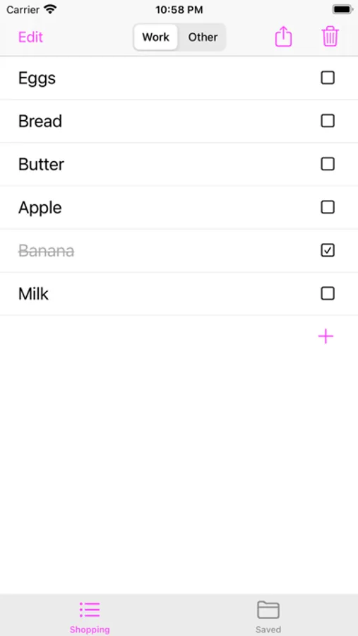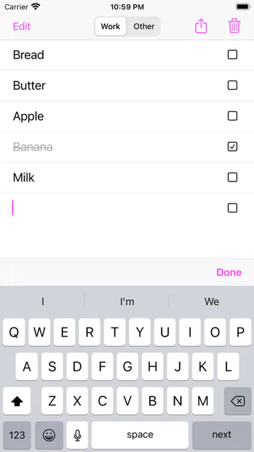 + Checkbox: checkbox can be touched to mark done/un-done button. If Delete button pressed, the done items (in that section) will be deleted.