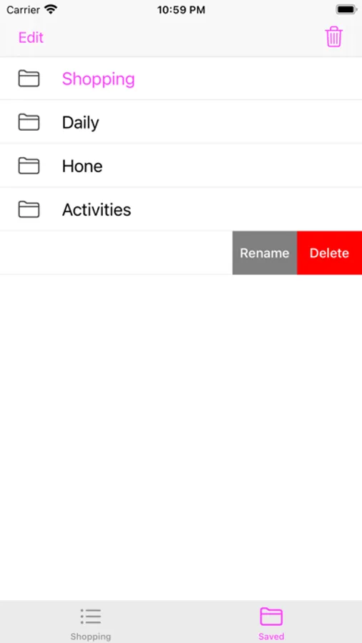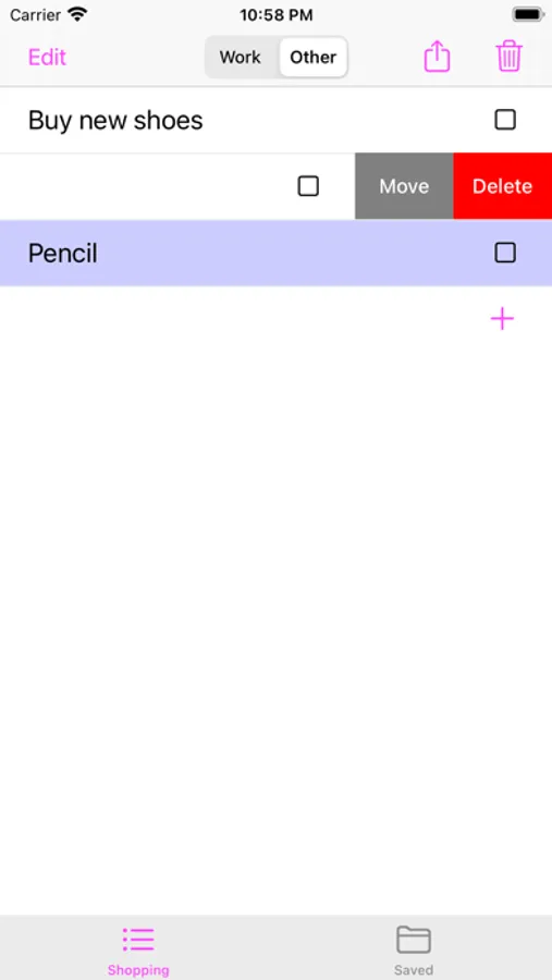 + 2 sections of to-do items, "Work" and "Other", the items in these 2 list can be switched to each other by swiping from right to left and choose "Move".