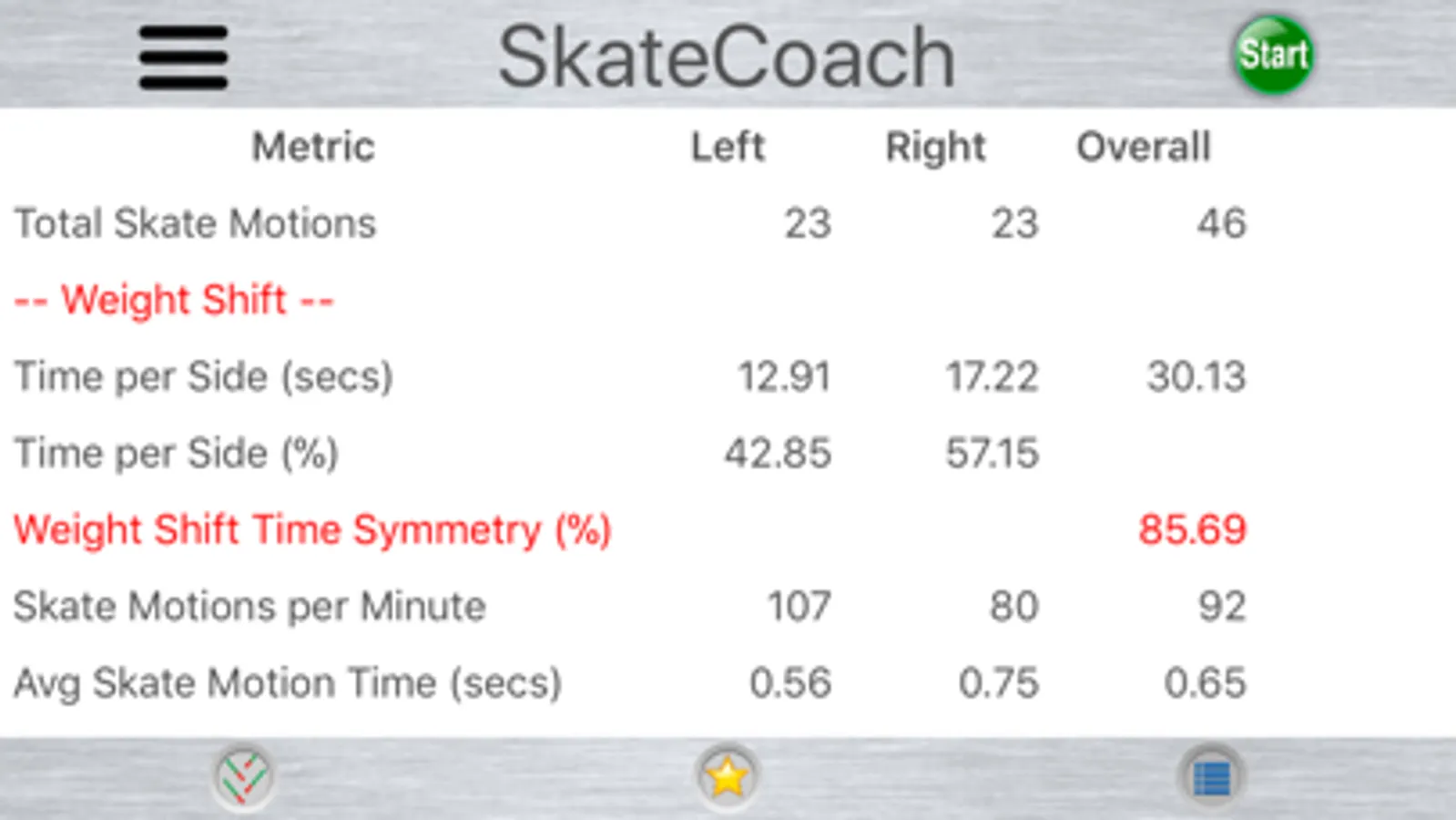 The SkateCoach app records skate motion metrics and scores the quality of the skier's skate technique. After the SkateCoach app is used to record data from a sample session, detailed information about one's skate technique can be reviewed. Types of information that is presented for technique analysis are: weight shift, glide, ski angle, acceleration and velocity metrics.