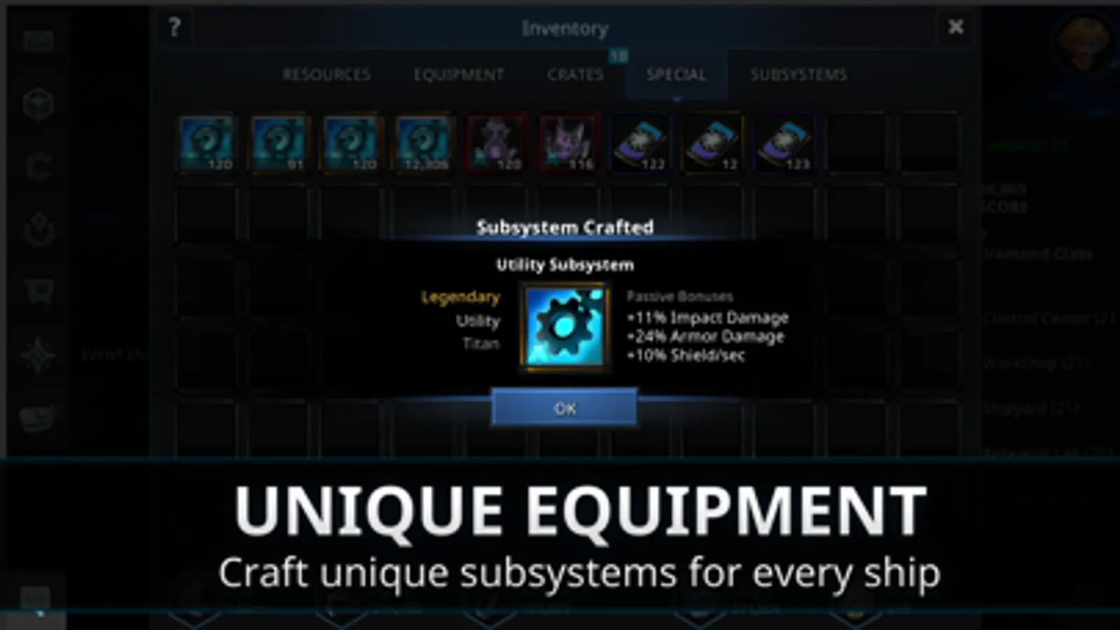 Upgrade your stations workshop to craft new weapons and fittings, forge weapon cores together to craft legendary versions.