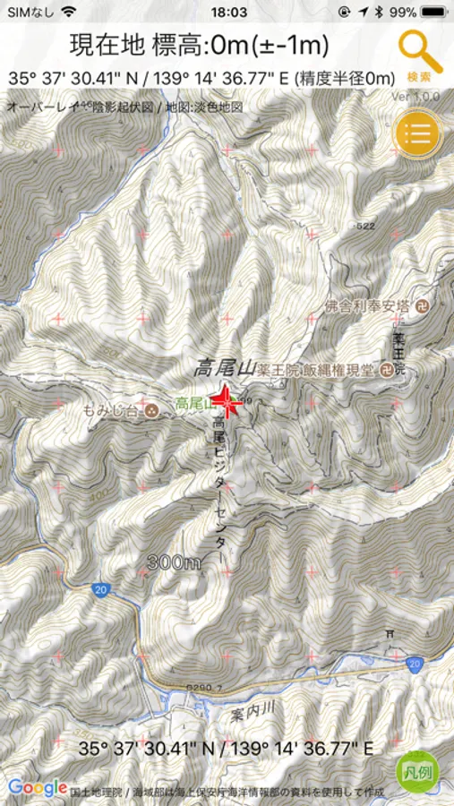 画面に表示した地図は200MBまで自動でキャッシュされるので(※)、携帯圏外の山奥や機内モードでの使用も可能です。登山での簡易GPSアプリとしても使えます。
