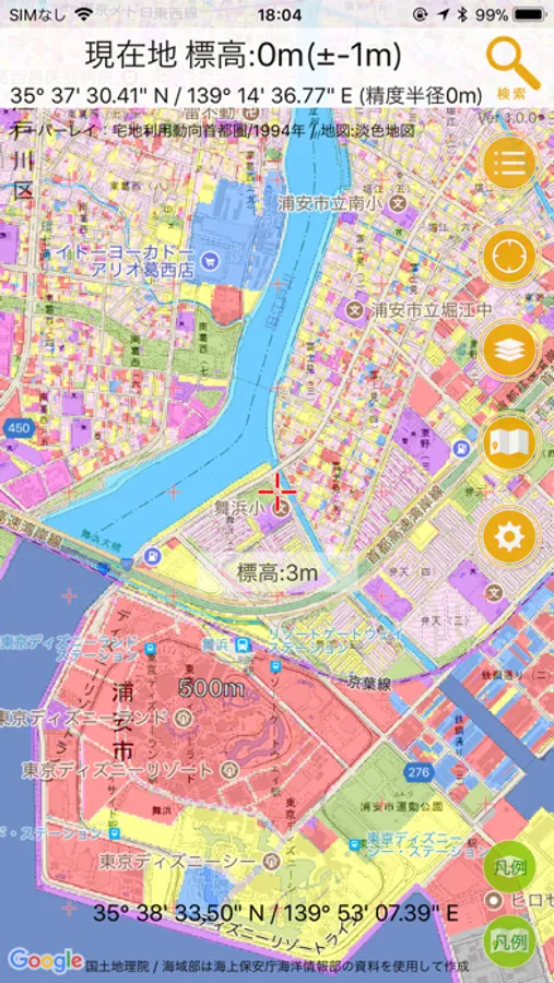 画面中央地点の標高を簡単に確認できます。災害対策などに利用してください。