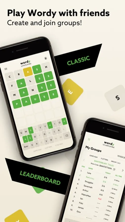 Create & Join groups with your friends to keep track of scores on the Daily Wordy! Play every day to climb to the top of the group and take the number 1 spot! Whoever guesses in the fewest attempts wins!