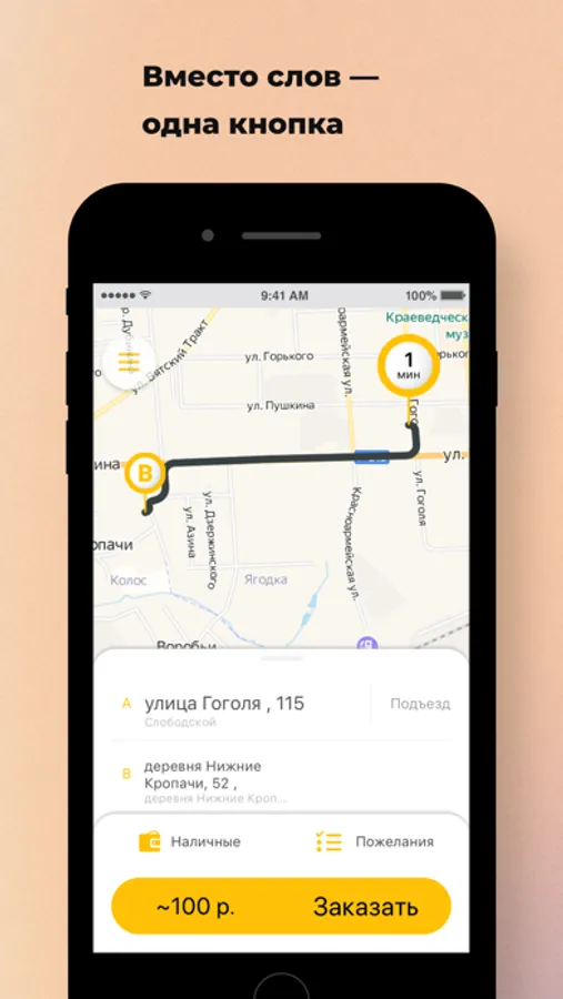 Откройте приложение, укажите адрес и закажите такси, нажав на одну кнопку.