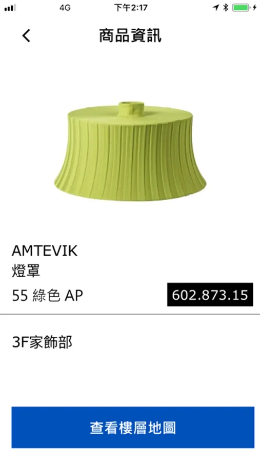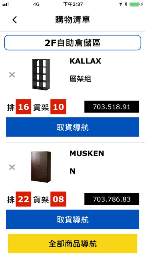 查詢完成,顯示商品資訊並可加入購物清單,家飾部商品顯示所屬樓層資訊,位於自助倉儲區商品則顯示排與貨架數字。