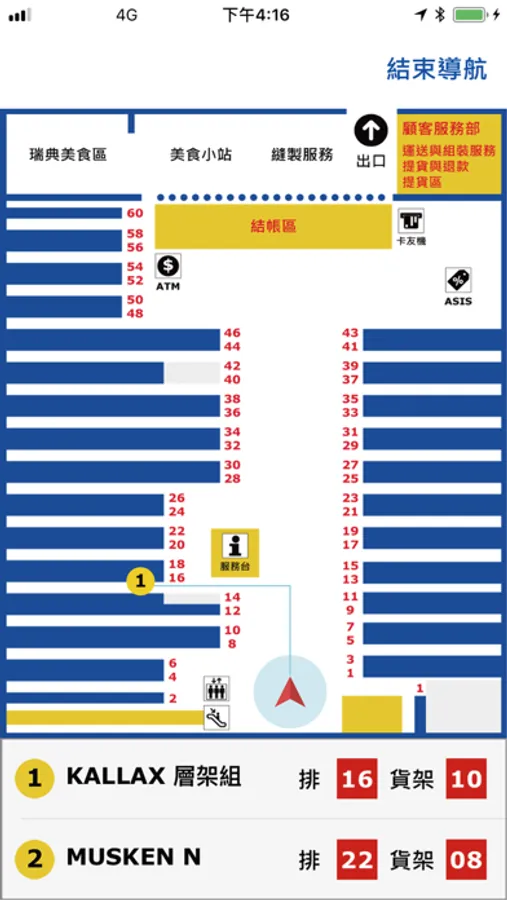 選擇單一或全部導航後,平面圖導航畫面會顯示使用者、商品位置,以及導航路線。點選畫面黃色圓點,會顯示該商品資訊以及貨架位置。