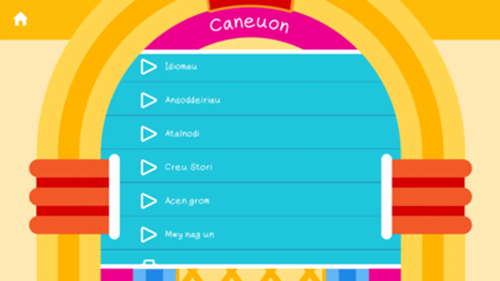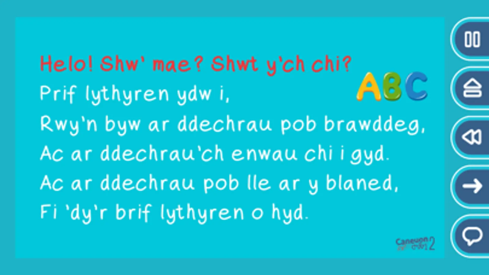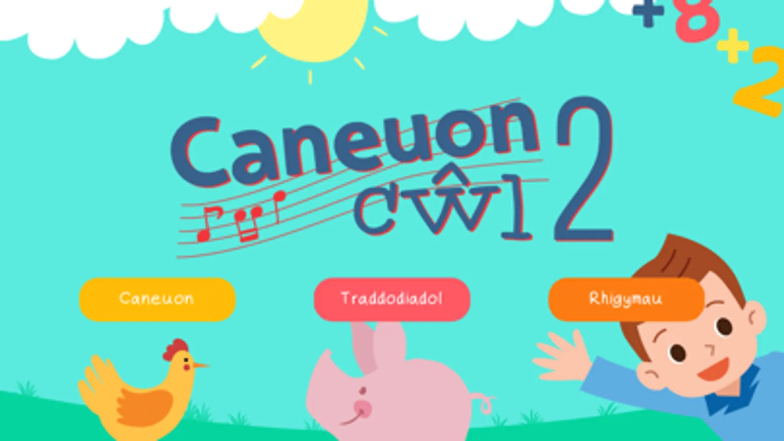 Here is an App for children between 5 - 7 year old that includes thirty new, original, fun songs by renowned singer song writers, Caryl Parry Jones and Steffan Rhys Williams. All the songs have different themes, and all of which have been composed accordingly to support and aid teachers to deliver certain aspects of the Foundation Phase.