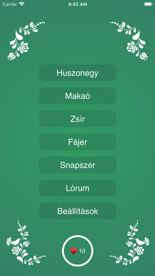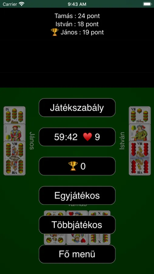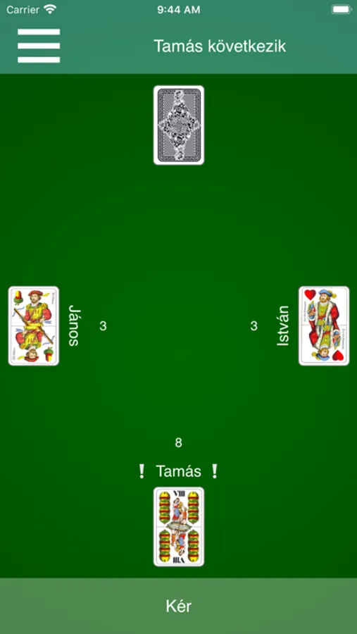 Hungarian card games played with 32 card German suited pack with picture cards showing characters from the William Tell legend, and the aces depicting seasons of the year. The suits are hearts (Piros), bells (Tök), acorns (Makk) and leaves (Zöld), and the cards in each suit are ace (Ász), king (Király), over (Felső), under (Alsó), 10, 9, 8, 7.