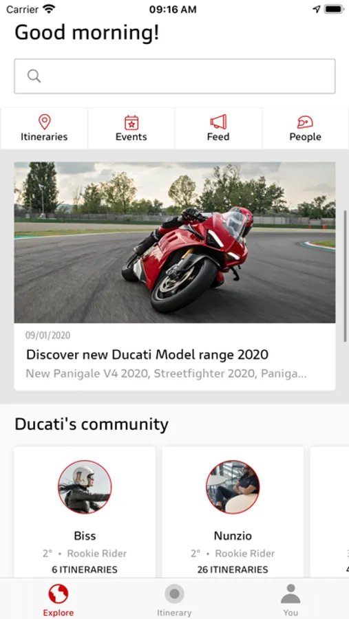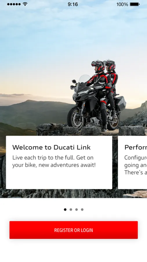 Access the App with your Ducati account or create your profile to stay connected with the Ducati digital world. Add your picture (a picture/photo of you) and your nickname and immediately connect your bike to start travelling (your journey).