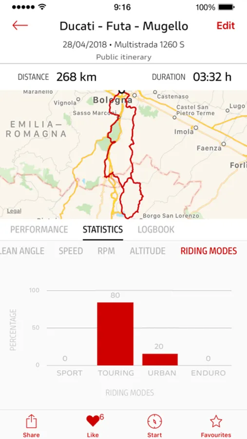 - Record your performance along the entire itinerary (route) (speed, bend angle, acceleration and other data mapped through the whole route, along with average maximum values and statistics)