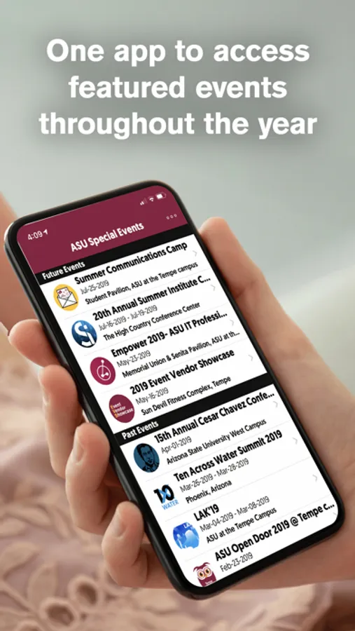 Used for select events at Arizona State University, the ASU Special Events app puts event information at your fingertips. By providing informative and interactive content, ASU Special Events app engages the audience and enhances the event experience. With the ASU Special Events app, you can: • Get more information for an event you are attending • View the event schedule and list of speakers • Find directions to the campus, venue or room • Connect and network with other attendees or speakers • Start or join thoughtful discussions • Explore, view and share visual content • Share the experience on social media • And more! * - Features vary per event