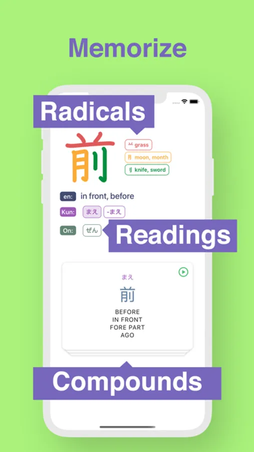- tons of Kanji related content: meanings, onyomi and kunyomi, kanji radicals, compounding words