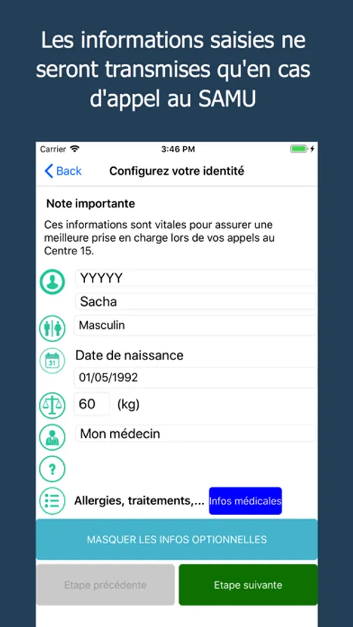 Si le Centre 15 du département depuis lequel vous appelez est équipé du logiciel de régulation eRM d'EXOS, l'application My15 transmettra instantanément lors de l'appel les informations que vous aurez pré renseignées (données personnelles : Date de naissance, poids, sexe et données de santé importantes à connaitre : Allergies, traitements et maladies chroniques) ainsi que votre géolocalisation précise, faisant ainsi gagner un temps précieux au SAMU.