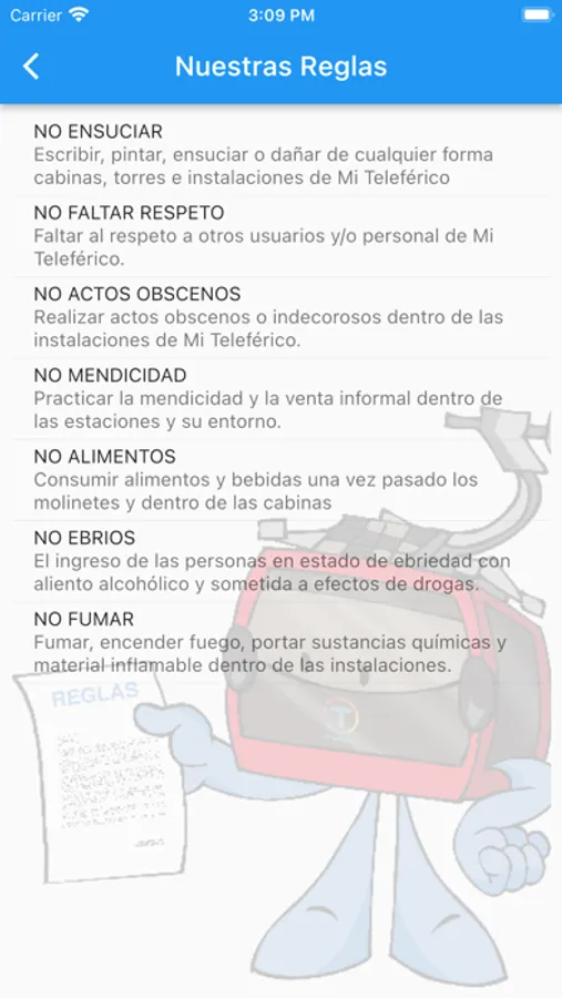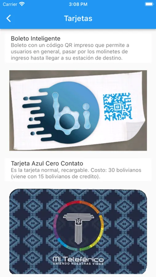 Les presentamos la aplicación del teleférico de los bolivianos. La empresa Mi Teleférico es el sistema de transporte urbano más moderno de Bolivia. Mediante líneas de teleférico integramos La Paz y El Alto, ambas ciudades hermanas separadas por la complicada pero a la vez maravillosa geografía del territorio. Con diez líneas actualmente en funcionamiento, la Roja, Amarilla, Verde, Azul, Naranja, Blanca, Café, Celeste, Morada y Plateada, más de 300.000 personas al día se benefician de este servicio de transporte y aportamos en el desarrollo de los bolivianos. Con esta aplicación podrás consultar todos nuestros servicios, mantenerte informado acerca de las noticias, programas, concursos, actividades y eventos de la empresa, solicitar información, realizar reclamos, sugerencias y mucho más. Mi Teleférico, uniendo nuestras vidas