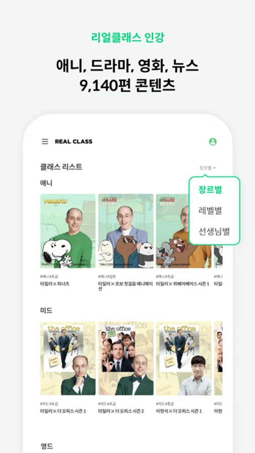 - 애니, 미드, 영화, 팝송 이제 뉴스까지! 내 레벨에 맞는 콘텐츠로 학습하면, 실력이 빠르게 향상돼요.