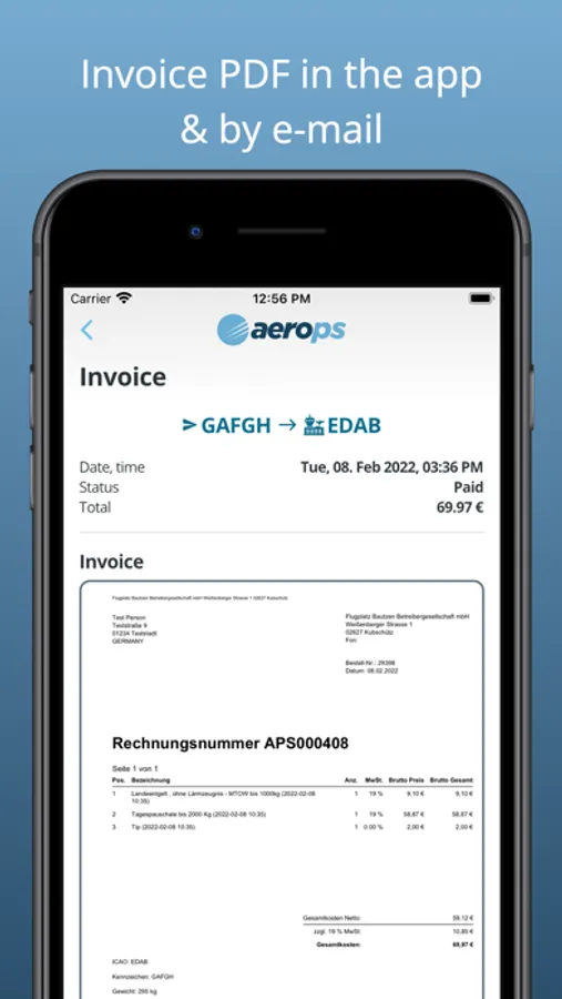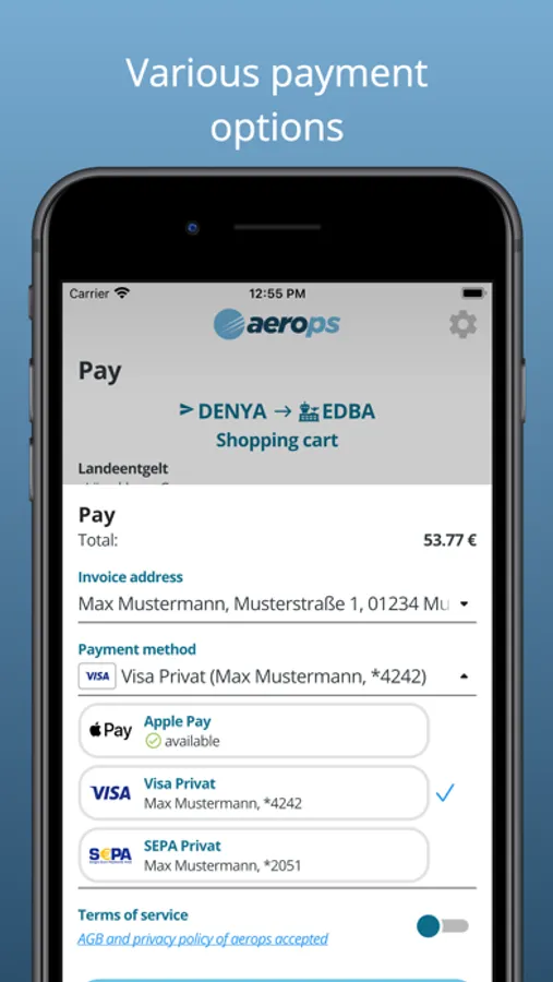 Additionally, you can use aerops for business and personal reasons. In the app you can store multiple billing and payment methods. This makes it easier to separate between business and private flights. You automatically receive your invoice via email.