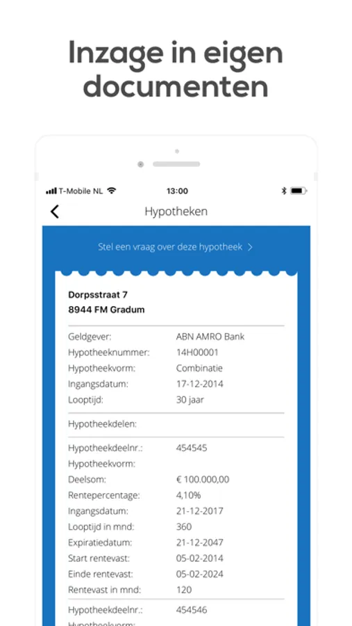 Via de verschillende tegels in het dashboard kunt u uw gegevens inzien. Ook kunt u via de app een vraag stellen over bijvoorbeeld uw polis of hypotheek.