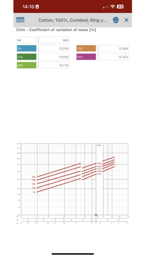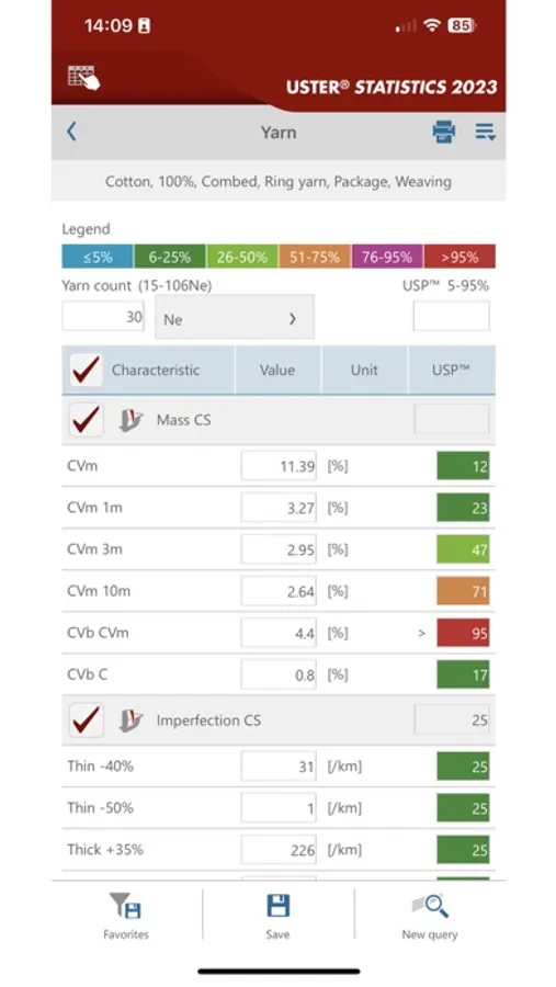 The unique benchmarking data of USTER® STATISTICS can be visualized in different views to suit individual needs. Users can define a preferred series of instruments and quality characteristics, making navigation to the required results even faster. For quick access to frequently used results, these can be stored in the app as ‘favorites’.