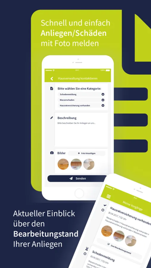 Als Mieter oder Eigentümer können Sie Schäden oder Anliegen direkt mit Fotos über unsere App melden. Ihre Anfragen stehen unseren Mitarbeitern dann zur Bearbeitung zur Verfügung und können auch an Handwerksbetriebe weitergeleitet werden.