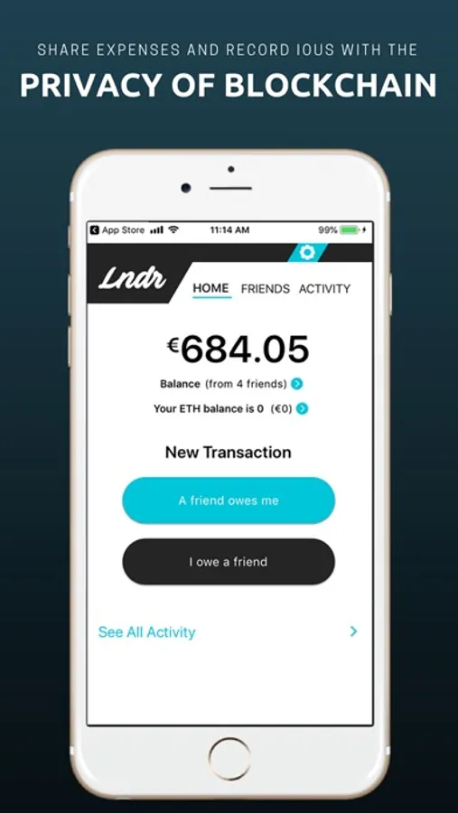 Sharing travel expenses or splitting a tab with a friend is easy, thanks to Lndr. It takes just a few seconds to add your friends, record a debt and settle up. Lndr is free* to use and doesn't contain any annoying ads or ask for any personal information. Unlike some of the other peer-to-peer apps out there, we don’t store, keep or sell any of your transaction details either. Your transactions are anonymously recorded to the Ethereum blockchain, offering best-in-class privacy and security.