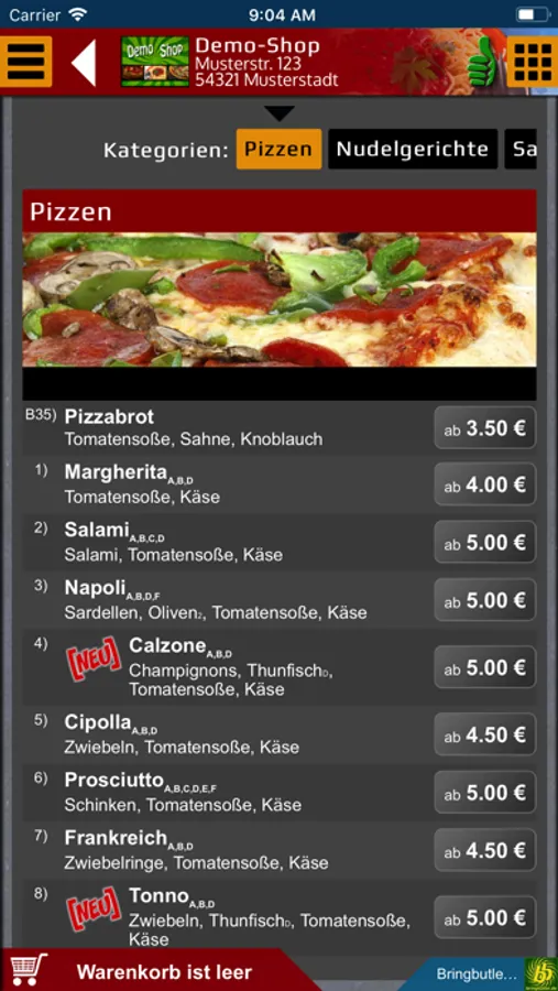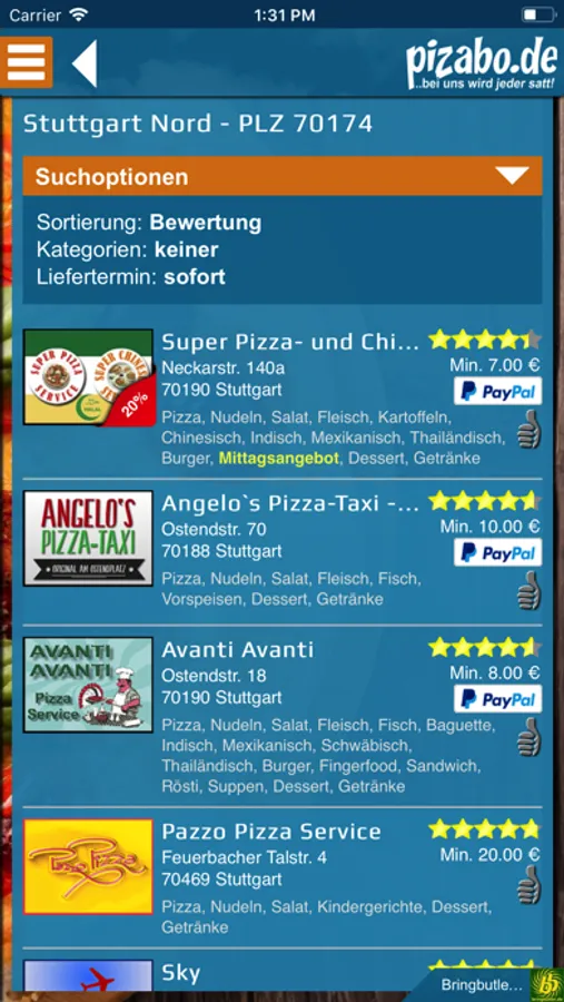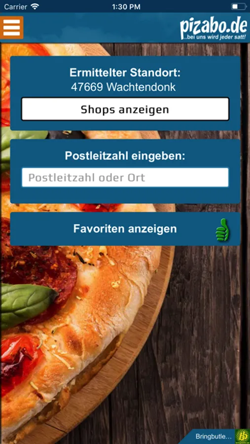 Die Pizabo-App erkennt Ihre Position automatisch oder Sie geben Ihren Ort oder dessen Postleitzahl ein. Schon werden alle Lieferdienste dargestellt, die zu Ihnen liefern oder bei denen Sie die Speisen abholen können.