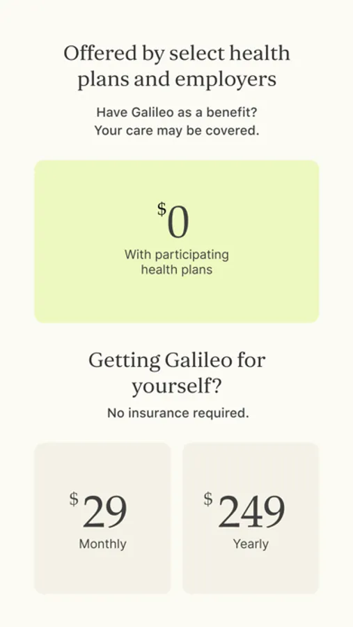 If you’re paying for Galileo yourself, pick a membership plan that works for you. Pay $29/month, $249/year, or $45 for a single visit. No copays or deductibles.