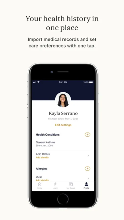 Use your profile to sync medical records, tell us your current health status, and pick care preferences.