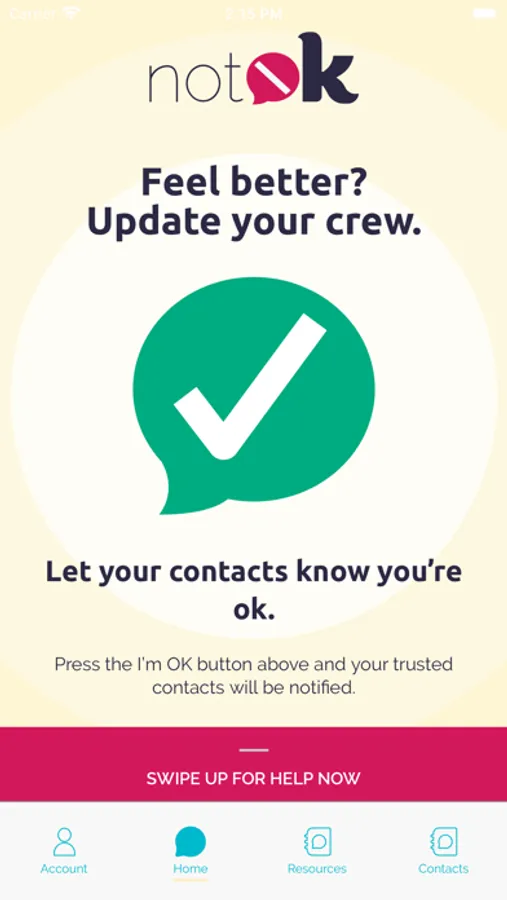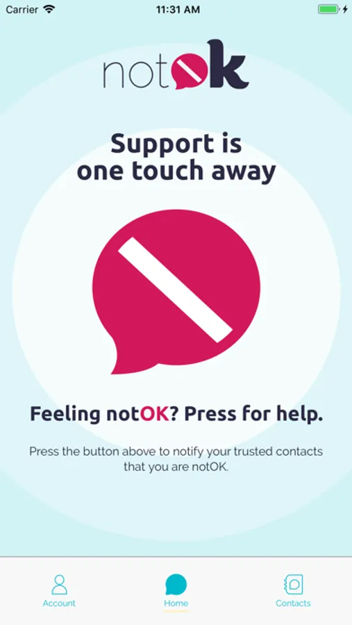 The notOK App® takes the guesswork out of asking for help when you're feeling vulnerable. We'll notify your trusted contacts that they've been selected as your support group, so when the time comes and you need to reach out, you'll just have to open the app and press the large, red notOK® button.