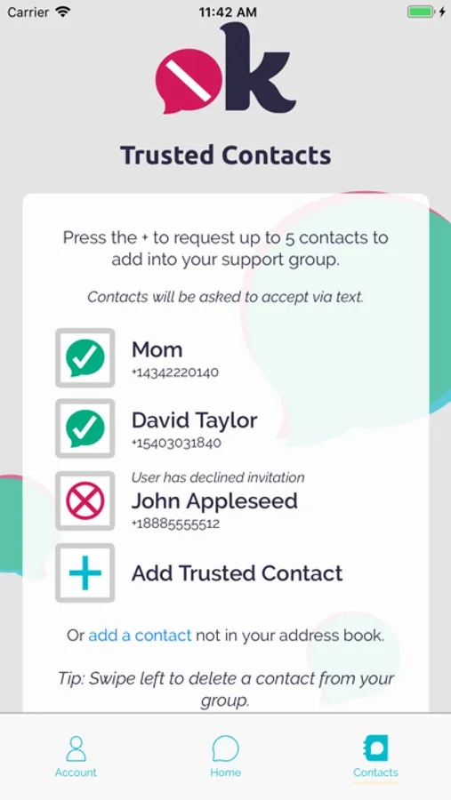 Add up to 5 trusted contacts’ (cellular phone numbers), using your native address book or manually.