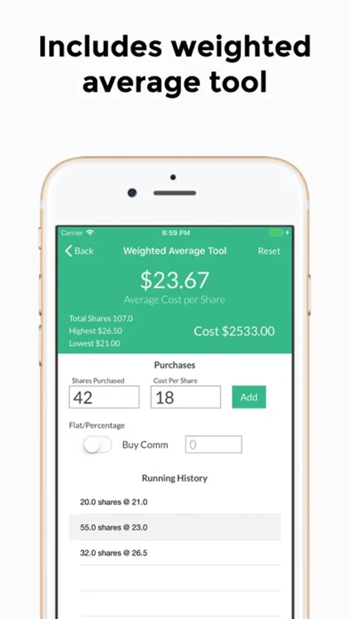Now includes a weighted average calculator! Just enter all of the purchase prices for the shares that you bought, and you'll get the average weighted cost per share, along with running history, highest paid, lowest paid, and overall cost - including any purchase fees.
