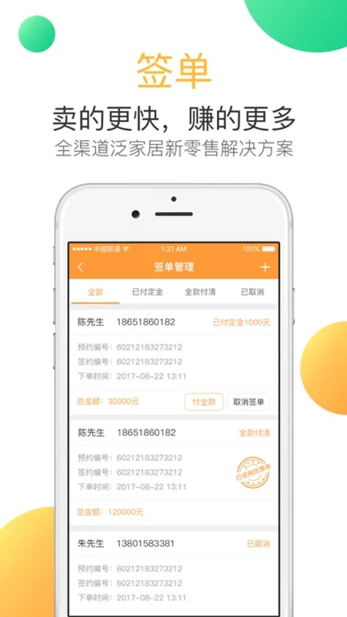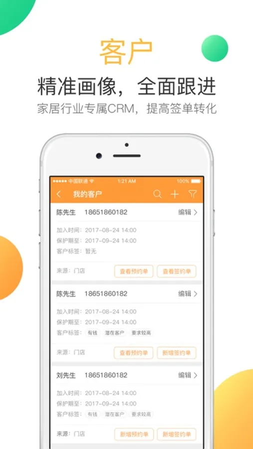 3.销售管理:自动录入所有客户订单,涵盖每位客户从预约到销售的全过程,全方位管理门店客户及交易进度;