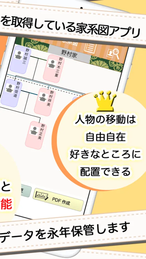 作成した家系図はスマホの画像フォルダやPDFファイルとして保存できるので、ご家族やご親戚の方とも簡単に共有することができます。