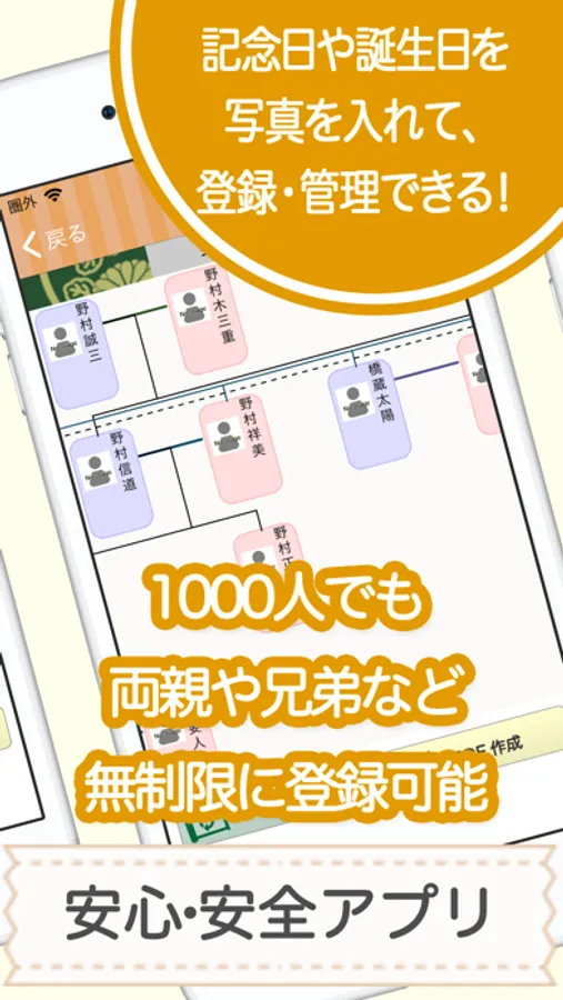 100名でも1,000名でも、無制限に登録できる、名字検索No.1の名字由来netが提供する家系図アプリです。