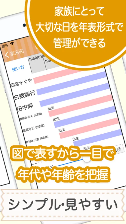 ・どなたでも50人までご登録いただけます。親、兄弟、叔父、叔母、いとこ、はとこ、祖父、祖母、曽祖父、曾祖母、高祖父、高祖母やひ孫、玄孫、来孫、昆孫などの子孫まで、たくさんの親族が一つの系図で見られます。続柄がわからなくても、直感的に登録できます。