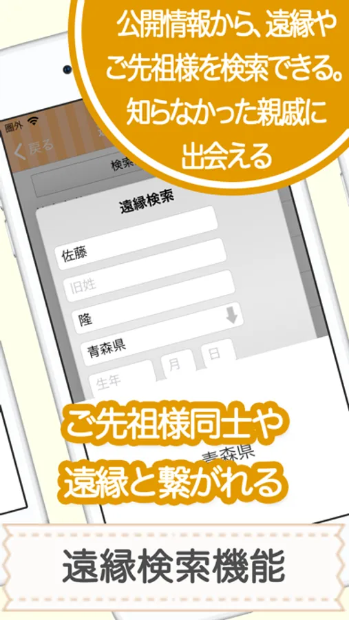 ユーザー様の公開情報の中から、遠縁やご先祖様を検索し、知ることが可能になります。