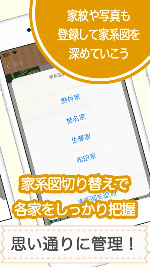 家系図に家紋を登録できます(数千種の家紋から選択し、登録可能)。