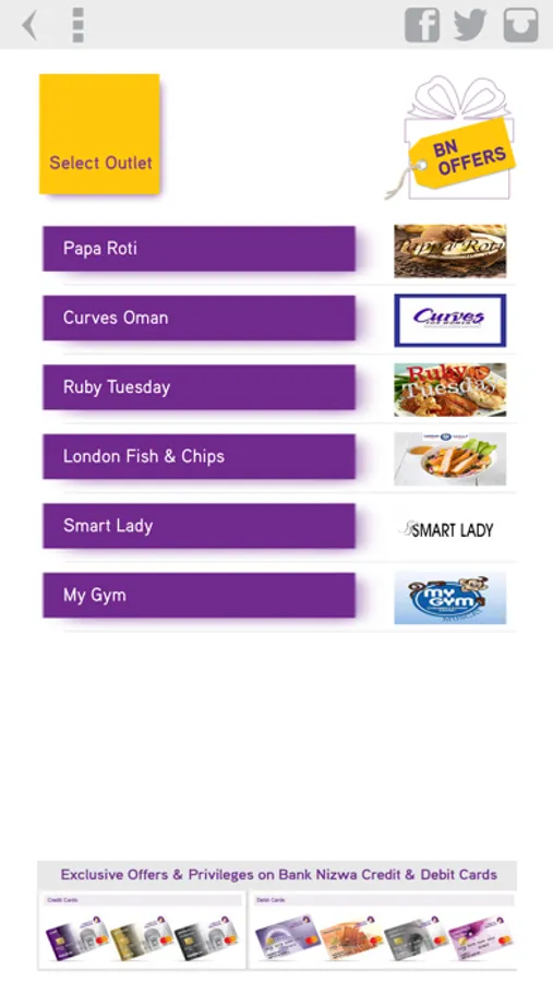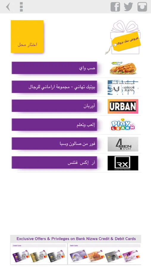 All Bank Nizwa debit & credit card holders (except basic credit card) are eligible to avail the discount offers. Visit any store listed in the application, pay by Bank Nizwa card or just flash your debit & credit card to the staff (pay by cash) to avail the discounts.