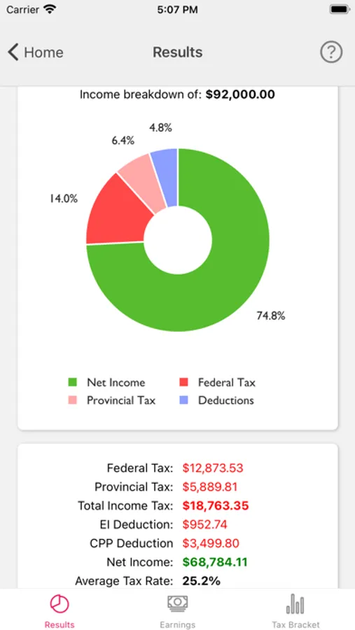 Given the annual expected earnings for the year, the calculator provides the total income taxes and EI/CCP/QPP deductions, and net income. It also displays a graphical representation of the income taxes, periodic earnings, tax bracket breakdown and comparison against other provinces and territories.