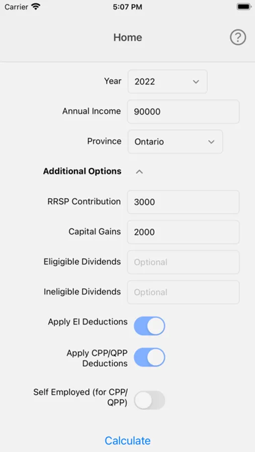 All tax calculations are done locally and will not leave your device. No tax input information is linked to the user. The calculator has an optional capital gains field, eligible dividends, ineligible dividends and RRSP contribution field. The RRSP input will be used to assess the RRSP refund that may contribute to a tax refund for the year.