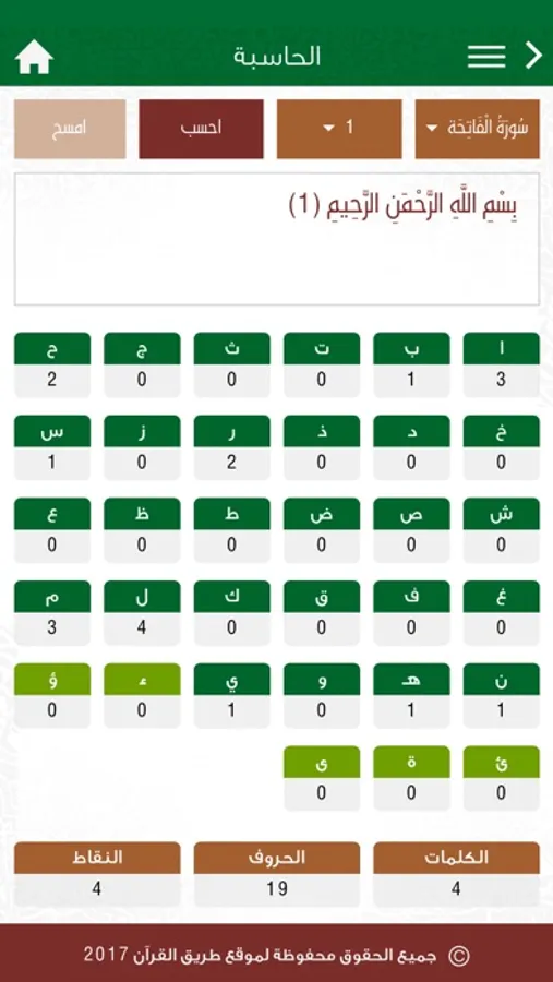 من خلال هذه الحاسبة القرآنية تستطيع أن تعرف تفاصيل إحصاءات أي آية من آيات القرآن الكريم بحسب قواعد الإملاء الحديثة، عدد كلماتها وحروفها وأشكال الحروف وتفاصيل تكرار هذه الحروف، ومجموع النقاط عليها. اختر السورة أولًا، ثم اختر الآية فتظهر أمامك الآية كاملة على لوحة الحاسبة، ثم انقر (احسب) لتعرض أمامك إحصاءات تفصيلية حول الآية. وعند الرغبة في إجراء حساب جديد اضغط (امسح) وكرّر الخطوة السابقة.