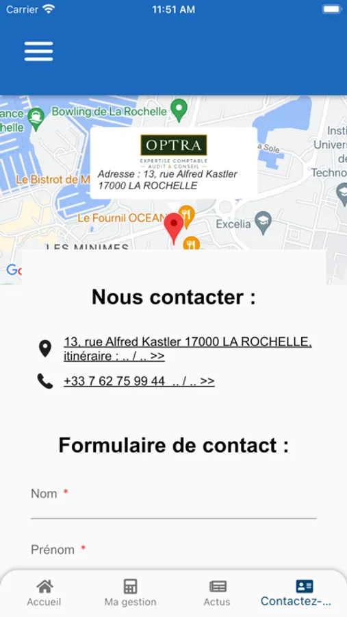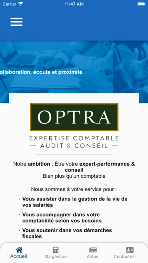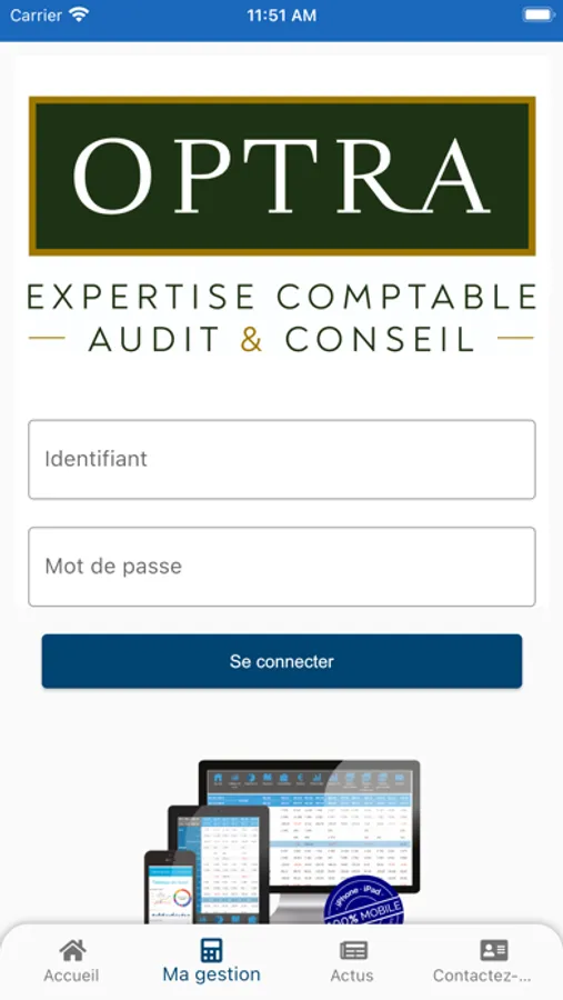 Notre application vous permet d'accéder à votre comptabilité en ligne et de nous géolocaliser.