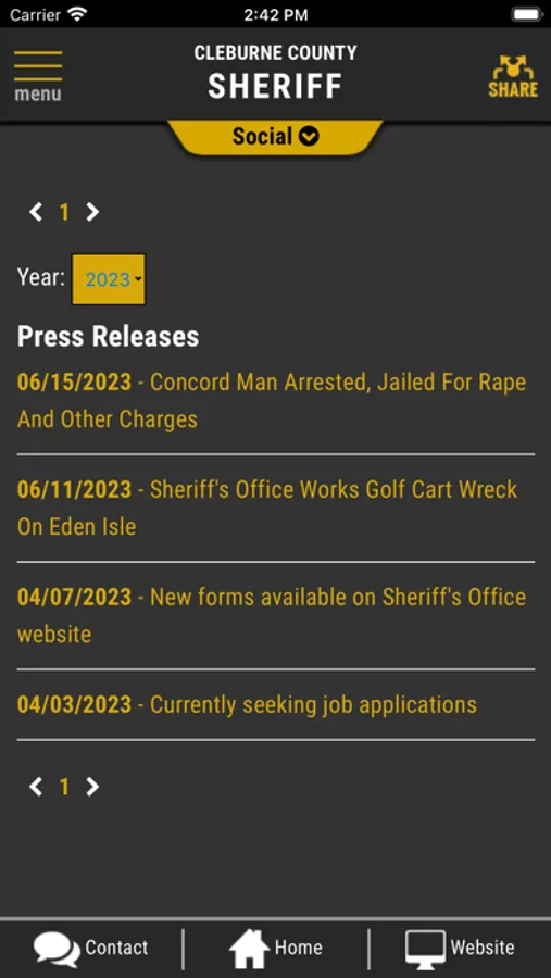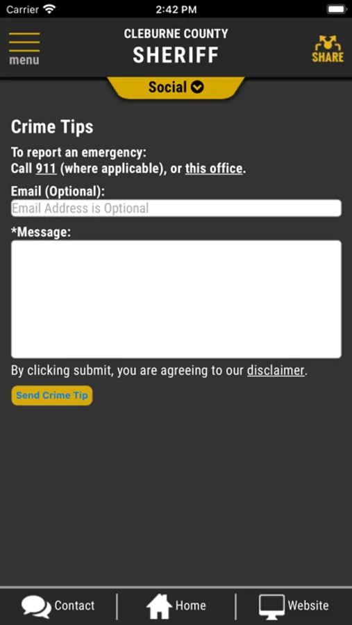 The app has public information for press releases, inmates, most wanted and sex offenders. Crime tips and contact us messages can be sent to the S.O.