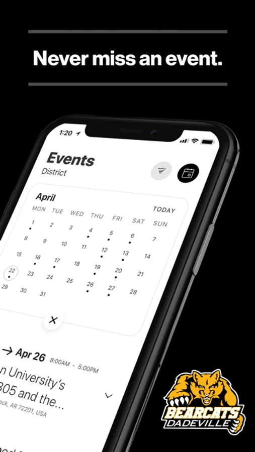 The event section shows a list of events throughout the district. Users can add an event to your calendar to share the event with friends and family with one tap.