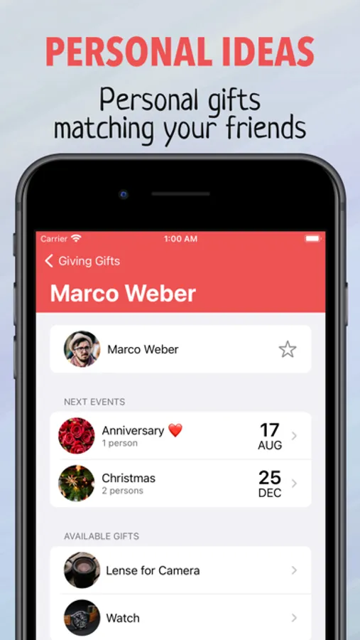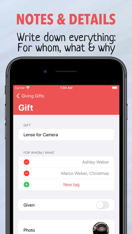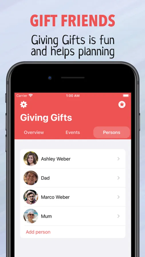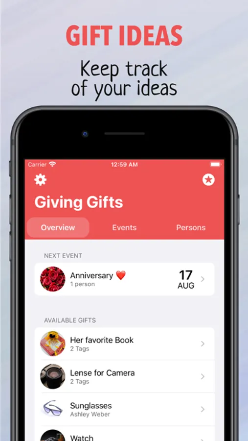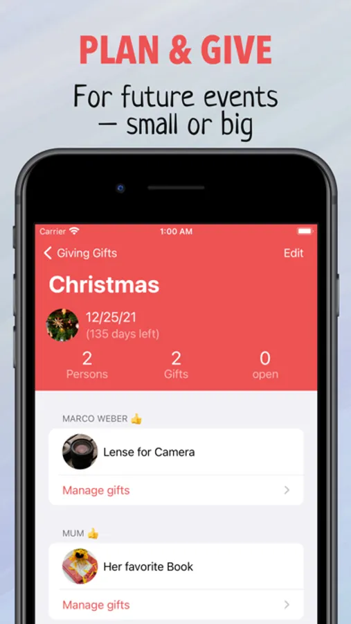 Giving Gifts is your personal gift assistant. No more forgetting your gift ideas. No more losing those tiny notes. With Giving Gifts you can easily organize and structure your gift ideas.