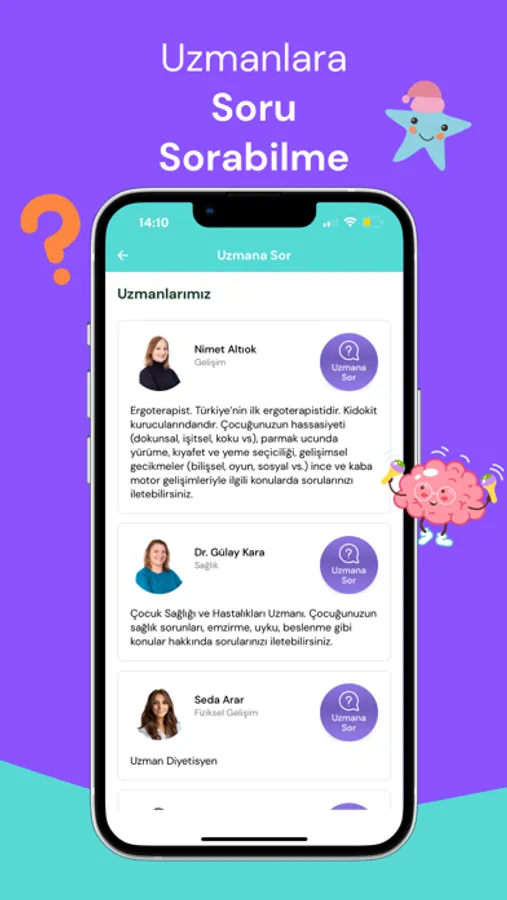 • Uzmana Sor ile Çocuk Sağlığı ve Hastalıkları Uzmanı, Ergoterapist ve Psikologlara danışma, uzman görüşü alma.