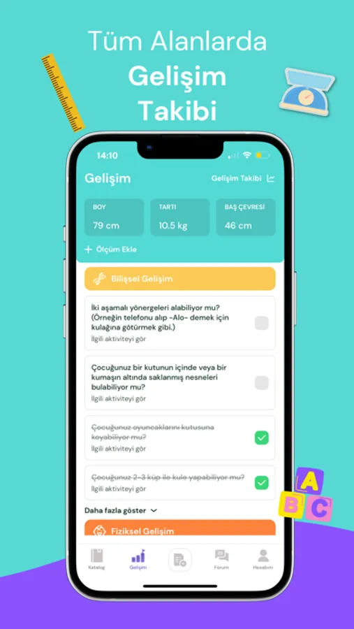 • Kilometre taşı sorularımız sayesinde, çocuk gelişimi ile ilgili tüm alanlarda takip.